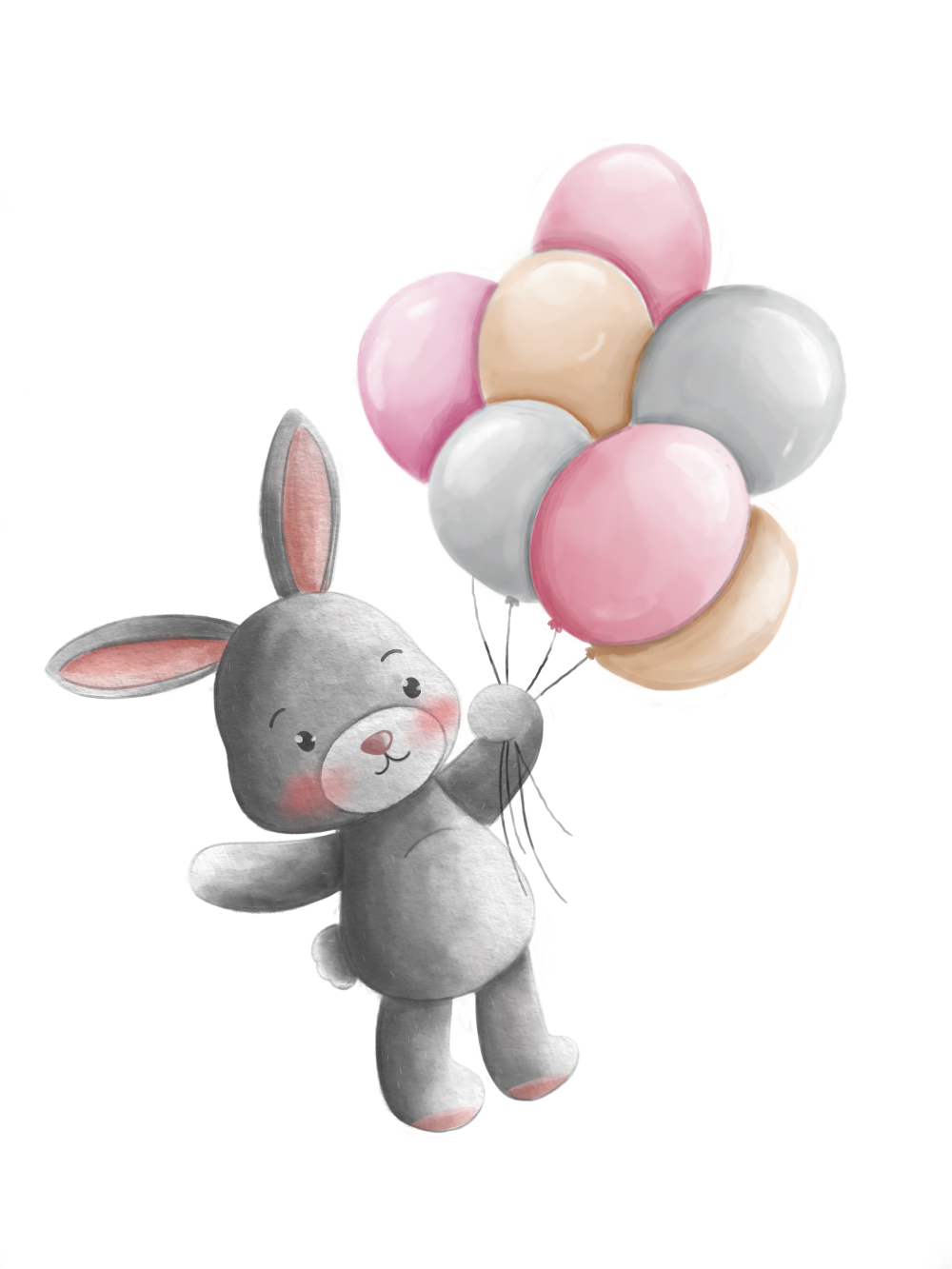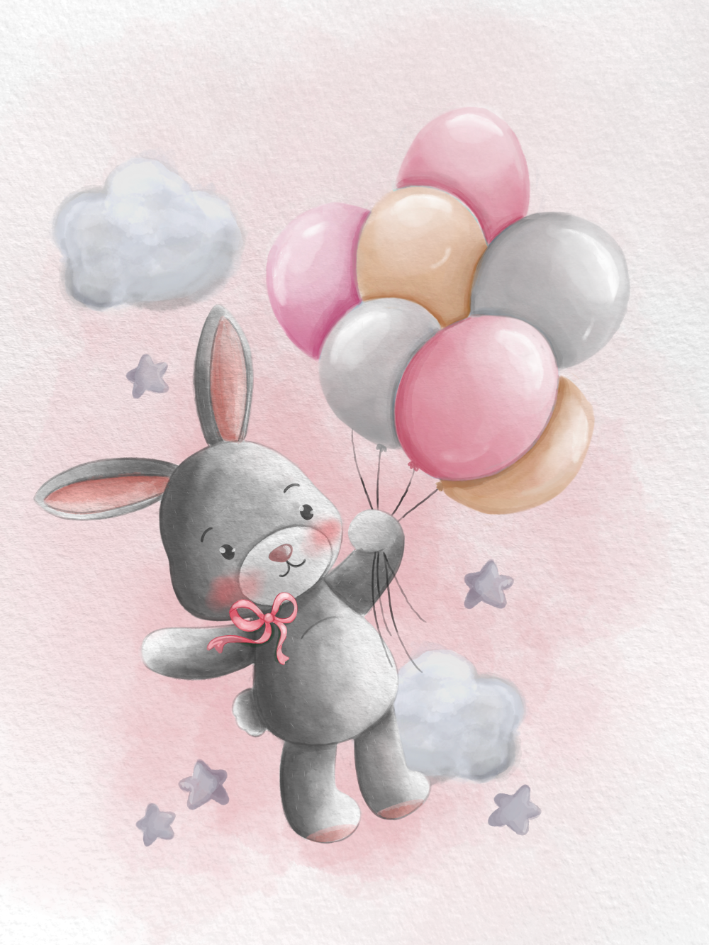 Originálny obraz alebo plagát do detskej izby, to je roztomilý zajačik/zajačik s balónikmi v rôznych farbách 🧸